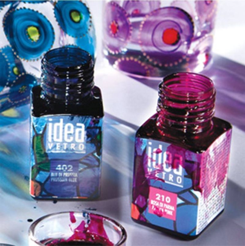 Професионална боя за стъкло MAIMERI Idea Vetro с ярки, прозрачни цветове и витражен ефект. Подходяща за декорация на стъкло, чаши, бутилки и други гладки повърхности. Идеална за художници, декоратори и DIY проекти.
